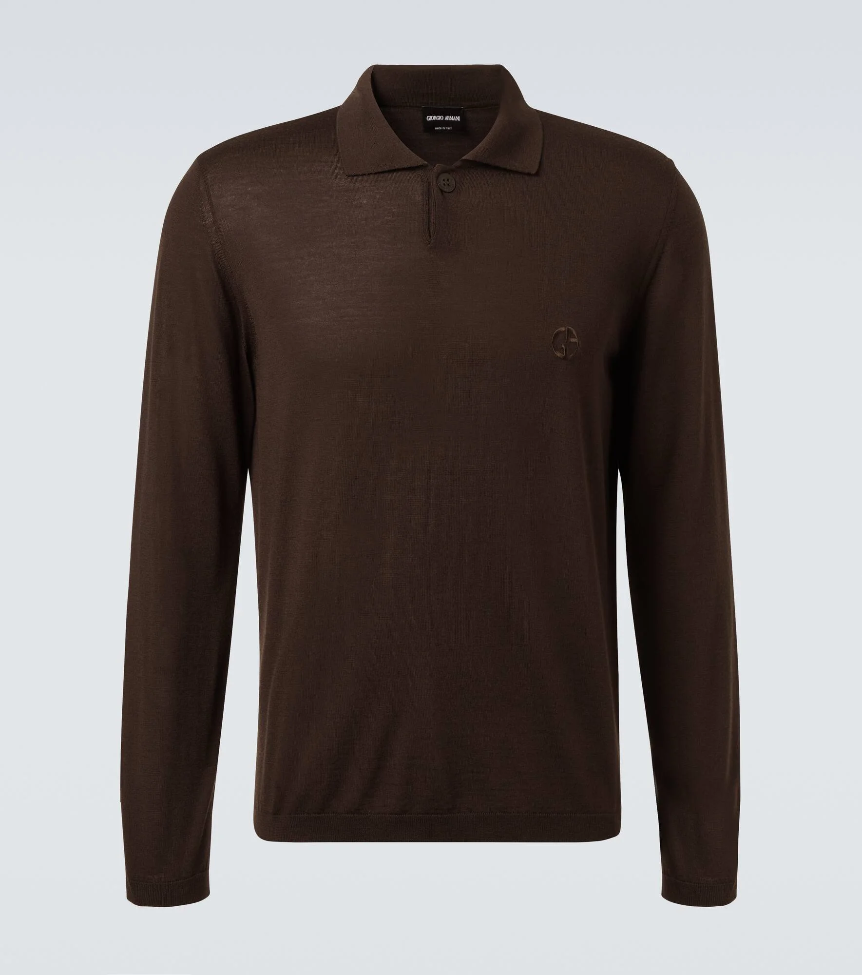 Known for its streamlined modernity, Giorgio Armani presents an elegant take on classic silhouettes and immaculate suiting. Crafted in Italy from virgin wool, this polo sweater features a ribbed hem and cuffs. Product Details - Material: 100% virgin wool - Care instructions: hand wash - Made in Italy - Designer color name: Mahogany - Item color: brown - Collar: polo collar - Closure: buttoned placket - Cuff: ribbed - Hem: ribbed - Item number: P01047867 Size & Fit - True to size - Designed for a loose fit - Stretchy fabric - Falls to the hip - The model in the picture is 185cm-6'1" and wearing a size IT 50