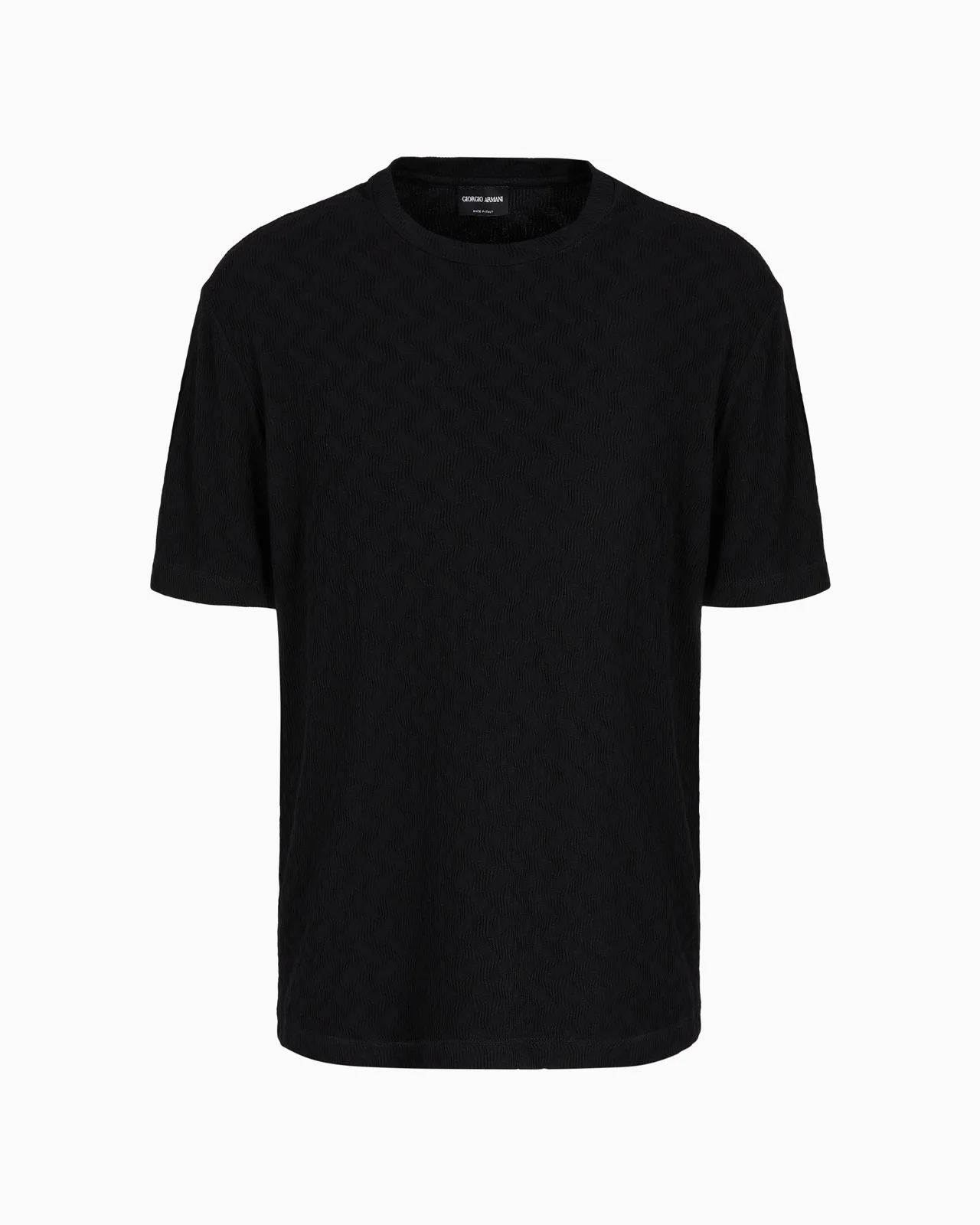 The monochromatic geometric jacquard motif distinguishes this short-sleeved crew-neck T-shirt made from viscose and cashmere jersey. This regular-fit style is defined by its minimalism and versatility, perfect for creating looks with a relaxed, effortless allure. Product Code: GM000243AF119801UC001 Details Composition 62% Viscose 29% Polyamide 7% Cashmere 2% Elastane Regular fit Crew neck Short sleeves Jacquard with geometric motif Made in Italy Fitting The model is 188 cm tall and is wearing size 48 / M