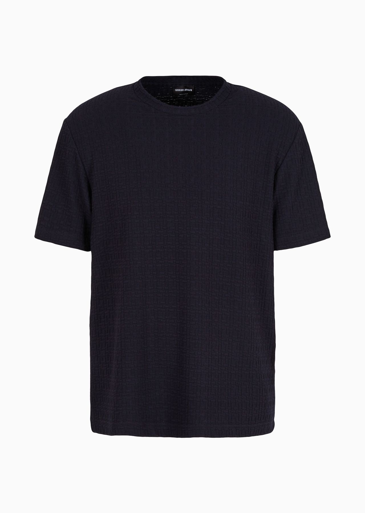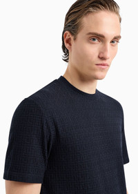 The monochromatic geometric jacquard motif distinguishes this short-sleeved crew-neck T-shirt made from viscose and cashmere jersey. This regular-fit style is defined by its minimalism and versatility, perfect for creating looks with a relaxed, effortless allure. Product Code: 3DSM71SJGUZ1UBWF Details Composition 86% Viscose 10% Cashmere 4% Elastane Crew neck Short sleeves Monochromatic geometric jacquard weave Made in Italy Fitting The model is 188 cm tall and is wearing size 48/M