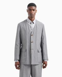 Distinctive single-breasted jacket made of viscose and linen and enlivened by a two-tone vertical striped motif. The style features a lapel-free V neckline, flap patch pockets and adjustable straps with metal rings, a stylistic yet functional detail. An offering with a modern style, perfect for pairing with the matching trousers to create a current, on-trend business suit. Single-breasted jacket V neck Three-buttoned, single-breasted closure Two patch pockets with flap Buttoned cuffs Adjustment strap detail on the sides Two back vents Length: 77 cm Made in Italy Product Code: GM001386TE14435M8153
