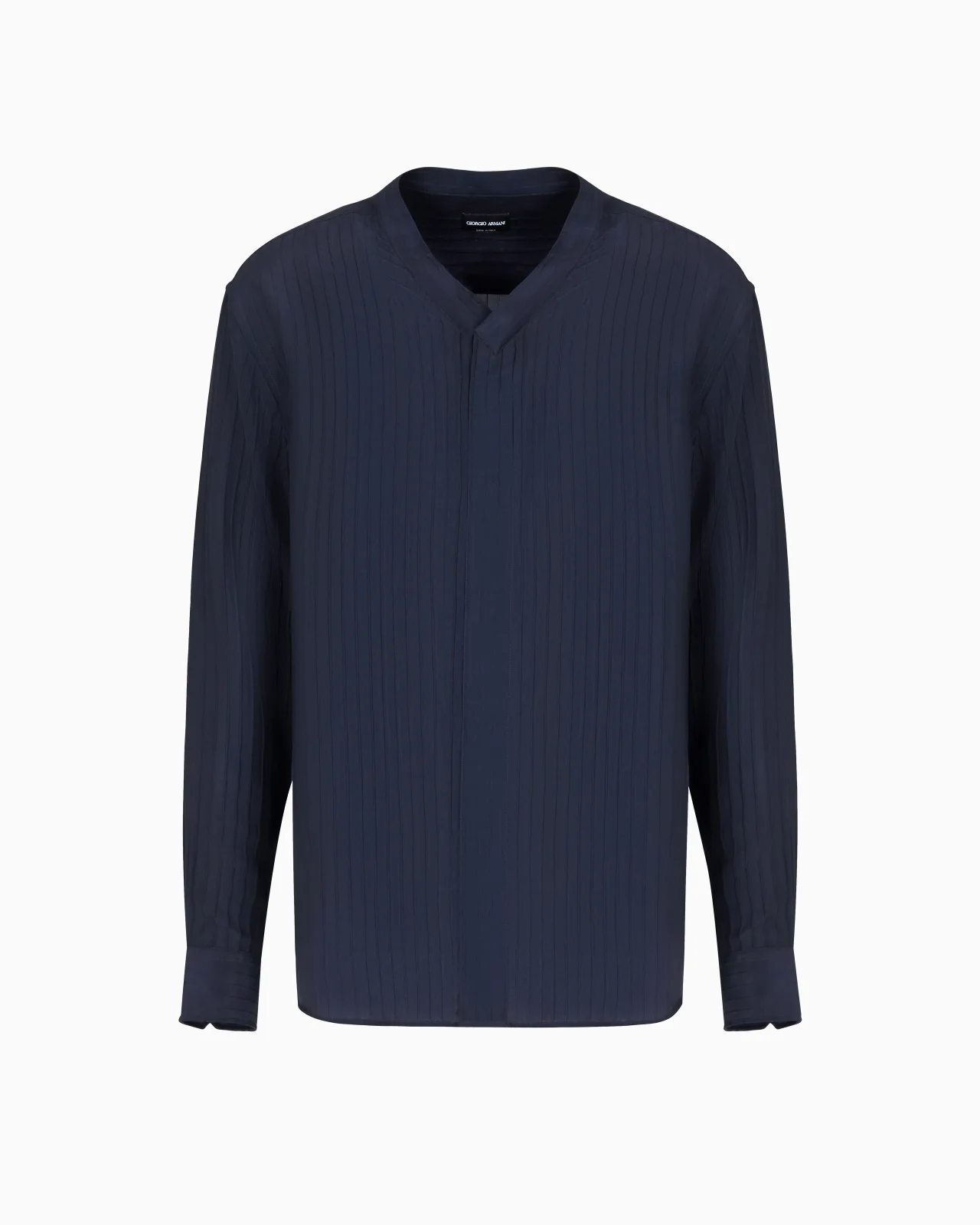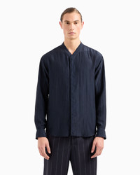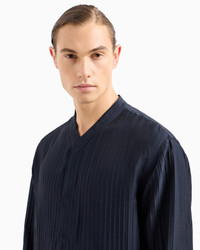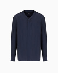 Viscose and silk shirt with relaxed, slinky lines available in the collection’s hallmark shades. The style, with its guru collar and exposed button placket, features a vertical striped jacquard that adds movement and gives it a three-dimensional look. A refined item that complements many looks. One-button guru collar Closure with five exposed buttons Buttoned cuffs with a sleeve placket Back yoke Product Code: GM001428TE14685UB102