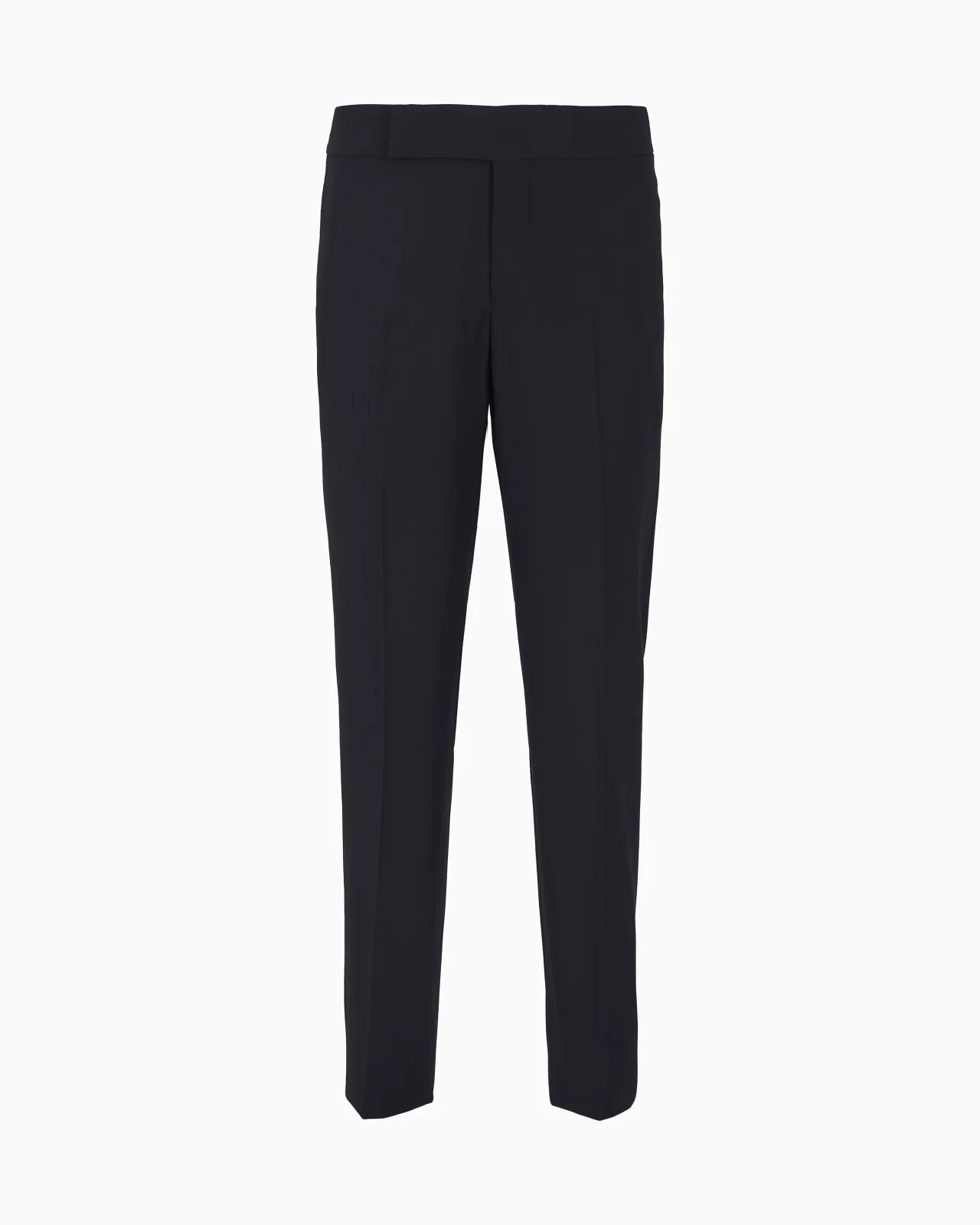 Elegant flat-front trousers made from wool crepe in a comfortable fit, a must-have in the refined man’s wardrobe. The garment is part of an exclusive capsule collection dedicated to special occasions, reflecting the iconic vision of elegance through the brand’s style codes. A sophisticated, timeless and elegant style in silk with geometric jacquard motifs and dense, luminous velvets that create an alluring play of light. Product Code: 4SGPP14JT002Z1UBUV Details Composition 100% Virgin Wool Flat-front style Hidden double-hook strap Concealed zip-and-button closure Two side welt pockets Two welt-pockets with button on the back Cuff width: 19 cm Made in Italy