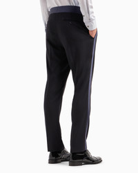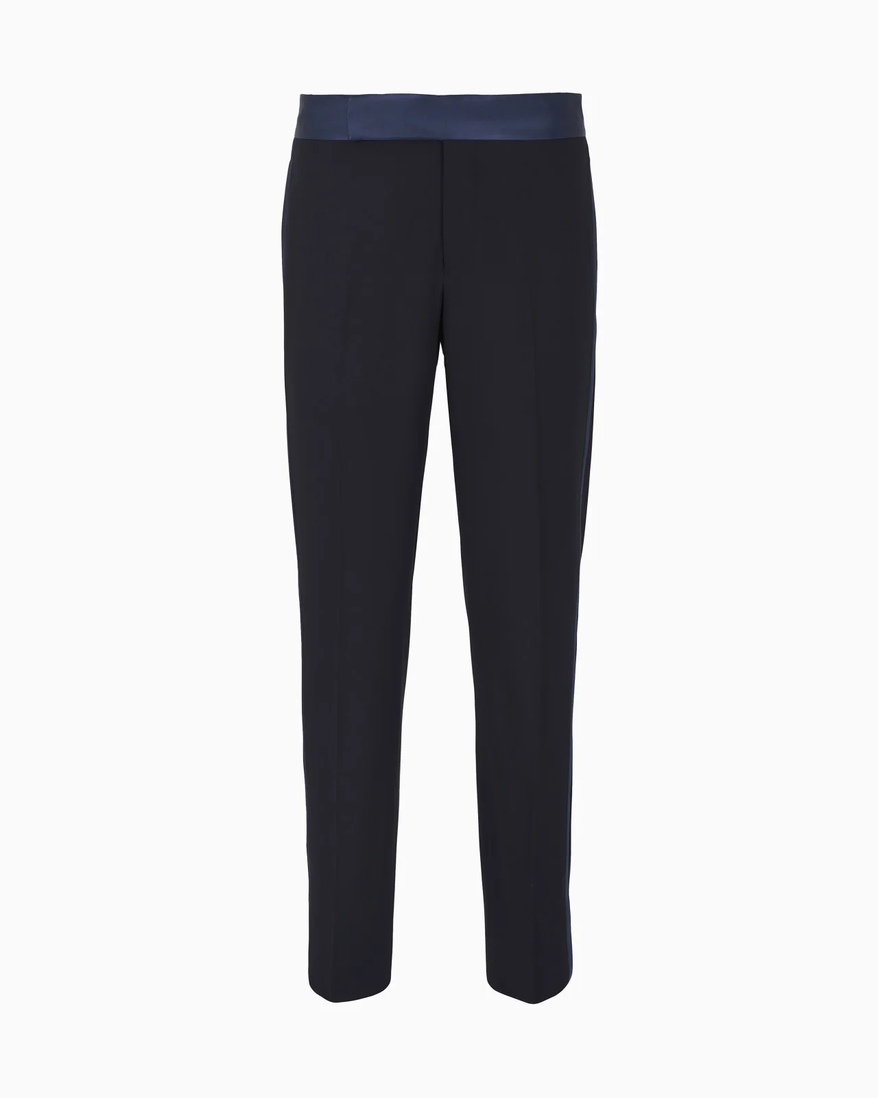 Elegant tuxedo trousers made from wool crepe in a comfortable fit, a must-have in the refined man’s wardrobe. The style is embellished with the iconic satin side strip, which is also captured on the strap. The garment is part of an exclusive capsule collection dedicated to special occasions, reflecting the iconic vision of elegance through the brand’s style codes. A sophisticated, timeless and elegant style in silk with geometric jacquard motifs and dense, luminous velvets that create an alluring play of light. Product Code: 4SGPP14IT002Z1UBUV Details Composition 100% Virgin Wool Flat-front style Satin strap Closure with concealed double hook, zip and one button Two side welt pockets Two welt-pockets with button on the back Satin side stripe Cuff width: 19 cm Made in Italy