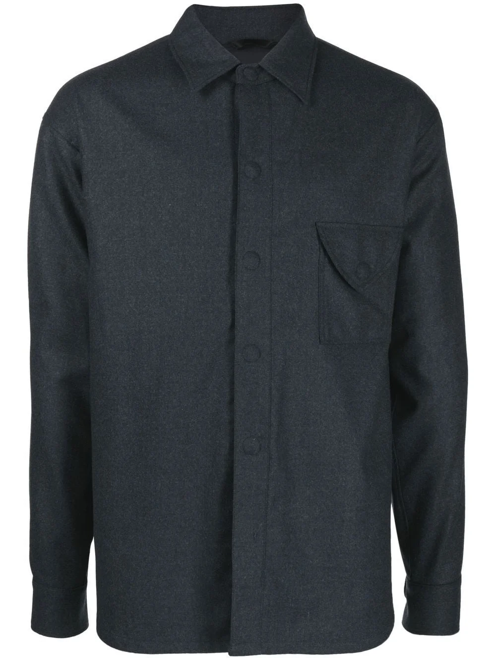 wool shirt jacket blue virgin wool blend classic collar chest flap pocket front press-stud fastening long sleeves buttoned cuffs straight hem Made in Italy Composition Outer: Virgin Wool 82%, Polyester 14%, Spandex/Elastane 4% Lining: Cupro 94%, Spandex/Elastane 6% SIZE & FIT Model measurements Height 6 ft 2 in(1.87 m) Bust/Chest 36.41 in(92.5 cm) Hips 37 in(94 cm) Waist 29.52 in(75 cm) FittingInformation This piece fits true to size. We recommend you get your regular size Cut for a loose fit Made with a mid-weight fabric