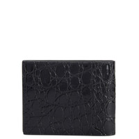 Product Details Bi-fold wallet in crocodile-print leather with metal detail, 2 banknote pockets and 8 inner card slots. - Black crocodile-print leather - Golden metal accessory - 2 banknote pockets - 8 card slots - Size: 118 mm x 95 mm ORIGIN: ITALY COLOR: BLACK