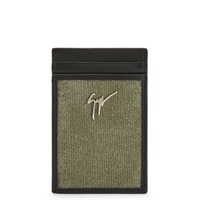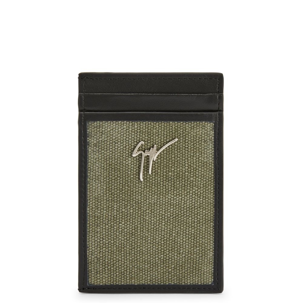 Product Details Card holder crafted from pure army-green pre-washed cotton, featuring the iconic nickel metal 'Signature' detail, with central pocket and 5 card slots. 100% army-green pre-washed cotton fabric Nickel metal 'Signature' hardware 1 divider 6 card slots Size: 110x70 mm Made in Italy