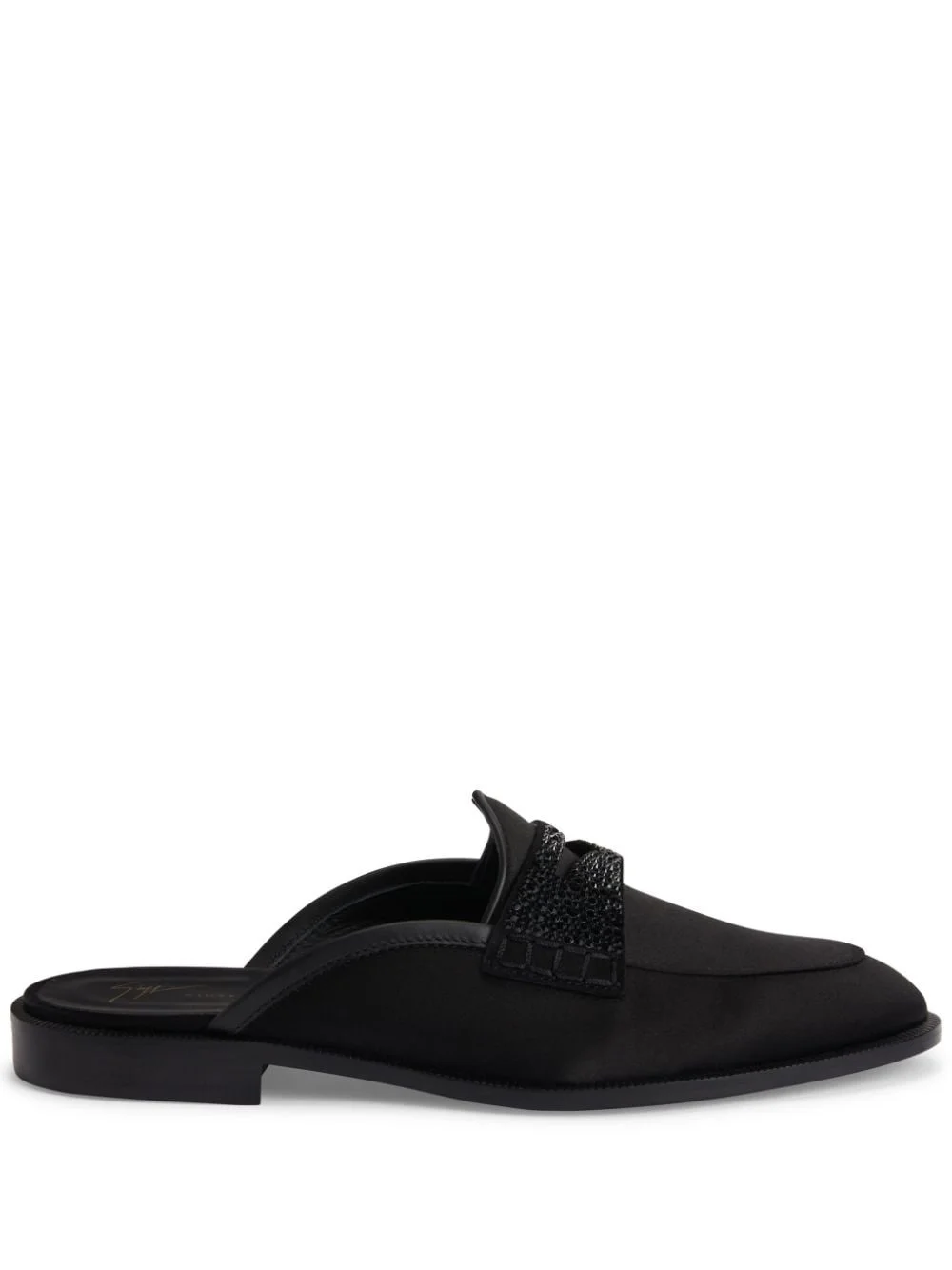 Bizeet slip-on loafers Highlights - Black - Suede/leather - Low block heel - Open back - Branded footbed - Penny slot - Crystal embellishment - Almond toe - Slip-on style Made in Italy Composition Outer: Fabric 100% Sole: Leather 100%