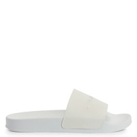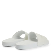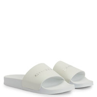 Product Details These slide sandals feature a white rubber sole and a matching leather strap embellished with a silver mirror-effect synthetic fabric 'Slogan' detail. White leather Silver mirror-effect synthetic fabric 'Slogan' detail White rubber sole with logo Made in Italy