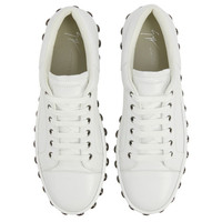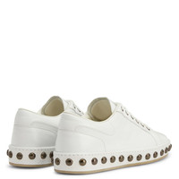 Product Details Low-top lace-up leather sneakers. Leather-covered rubber sole with metal studs. - Men's sneakers - White leather - High-frequency detailing on the label - Hot-stamped logo lettering on the white leather upper at the back - White laces and aged silver-coloured metal eyelets - Gunmetal grey metal stud embroidery on the white leather sole covering - Rubber sole with logo, covered in white leather ORIGIN: ITALY COLOR: WHITE