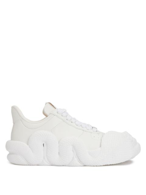 Product Details Pink leather ''Cobras'' trainers with tone-on-tone cotton laces and a small, logo-bearing silver and pink metal buckle. This shoe features the iconic white fabric Signature detail on the tongue and the new, bold pink rubber ''Cobras'' sole completes the bold design of this unique shoe. Pink leather Signature label Pink cotton laces Metal GZ accessory Rubber ''Cobras'' sole with logo