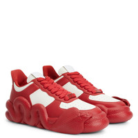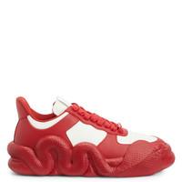 Product Details Low-top ‘Cobras’ sneakers crafted from red-and-white leather with matching cotton laces embellished by a red-and-silver metal deubré; an iconic white fabric 'Signature' detail with rubberised logo decorates the tongue and the new, bold red rubber 'Cobras' sole completes the edgy design of this unique shoe. Red-and-white leather White fabric and rubber 'Label Signature' Red cotton laces Silver-and-red metal accessory 'Cobras' print on the insole Red rubber sole with matching rhinestones and logo Made in Italy