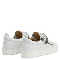Product Details Low-top lace-up sneakers in leather with two side zips, inlaid metal plaque and rubber sole. - Men's sneakers - White leather - Gunmetal grey metal strap plate - White laces - Gunmetal grey metal zip - White rubber sole with logo ORIGIN: ITALY COLOR: WHITE