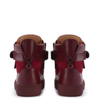 Product Details High-top lace-up sneakers in velvet and patent leather with two tone-on-tone plaques, side zippers and rubber sole. - Upper: 50% goatskin suede, 50% calfskin - Lining: calfskin - Insole: calfskin - Sole: Rubber ORIGIN: ITALY COLOR: BORDEAUX