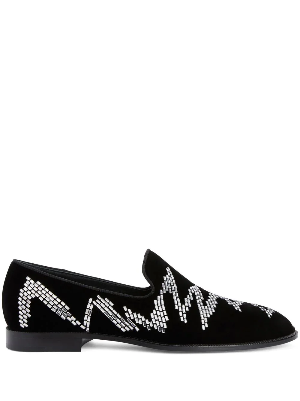 Jareth Shake loafers Highlights - Jareth shake loafers from giuseppe zanotti featuring black, leather, velvet effect, rhinestone embellishment, almond toe, branded insole and flat rubber sole. Made in Italy Composition Outer: Velvet 100%, Rhinestone 100% Lining: Leather 100% Sole: Leather 100% Inner: Leather 100% SIZE & FIT Measurement HEEL 0.78 in(2 cm)