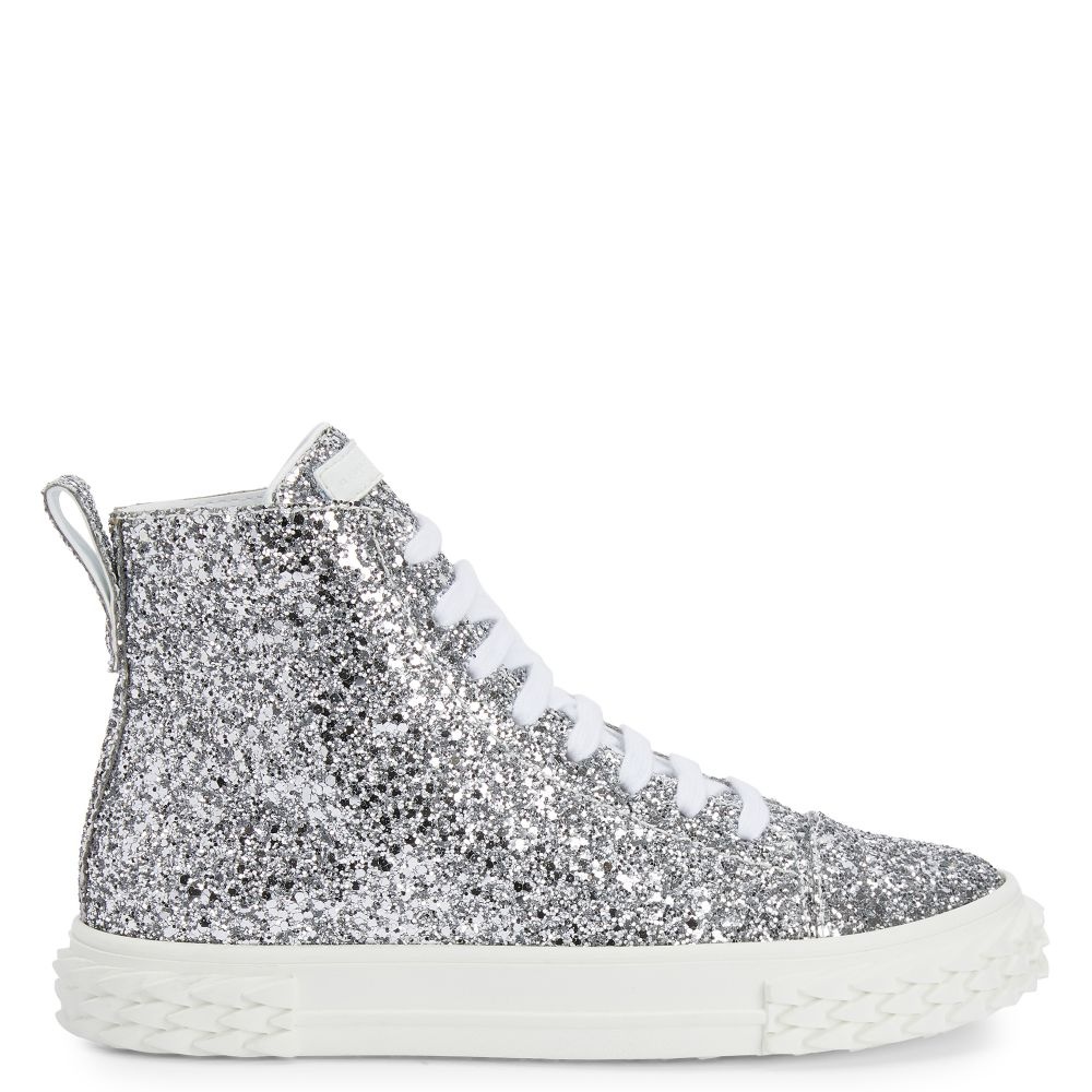 Product Details High-top sneakers crafted from silver synthetic glitter fabric with cotton laces, featuring a tone-on-tone 'Label Signature' on the tongue; the eye-catching, white rubber 3D 'Blabber' sole gives the design a perfect finish. Glitter silver synthetic fabric (54% RPET; 1% PET; 35% PL; 10% PU) Tone-on-tone 'Label Signature' on the tongue Cotton laces Rubber sole with logo Made in Italy