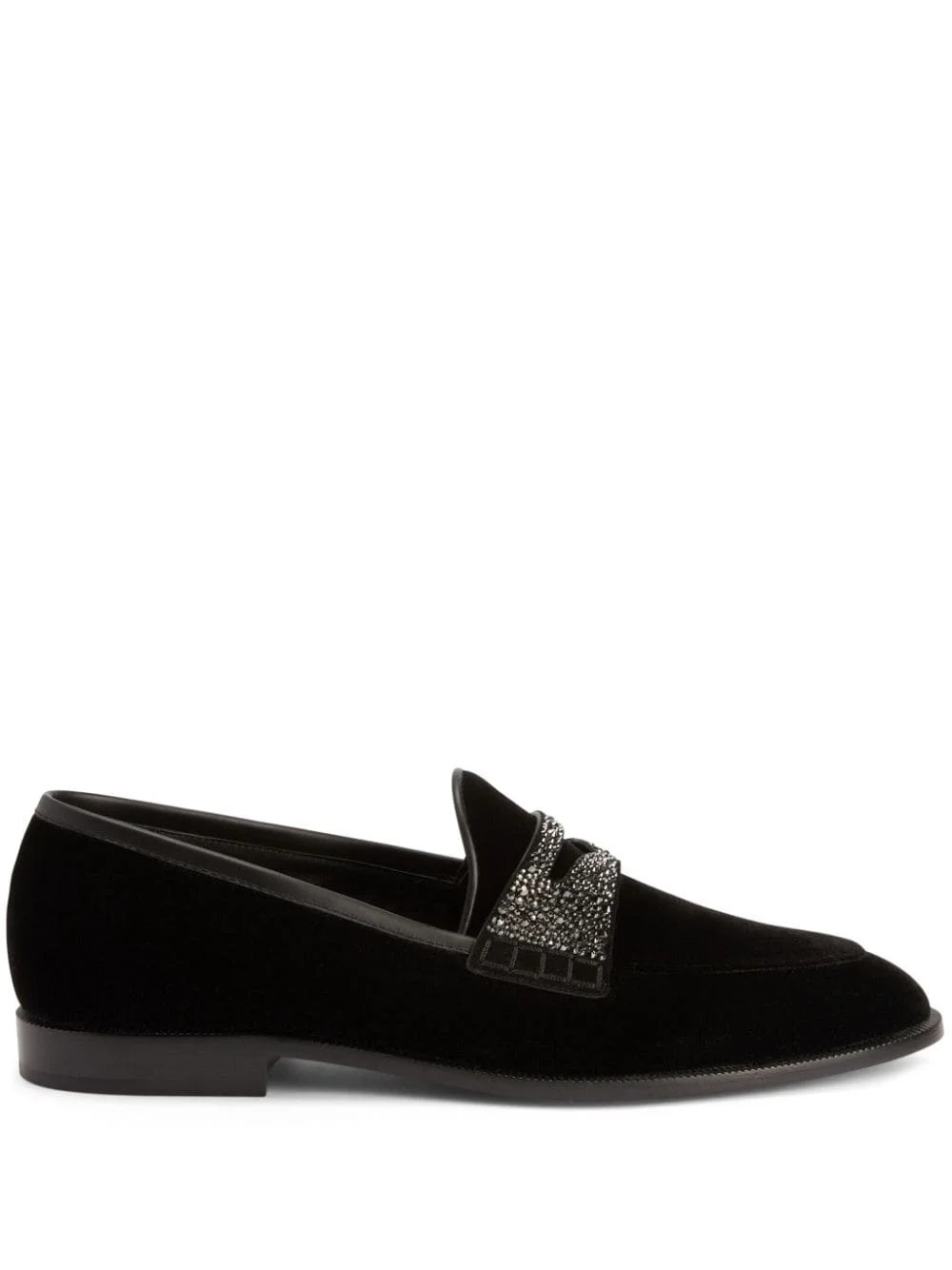 Ermy rhinestone-detail velvet loafers Made in Italy from plush velvet, this black iteration of the Ermy loafers are illuminated with light-catching rhinestones on their classic penny slot. Lined with smooth leather, the pair speaks to Giuseppe Zanotti's craftsmanship and attention to detail. Highlights - Black - Velvet - Slip-on style - Penny slot - Rhinestone embellishment - Almond toe - Branded leather insole - Low stacked heel Made in Italy Composition Outer: Velvet 100% Lining: Leather 100% Sole: Leather 100%