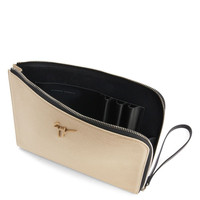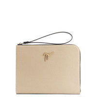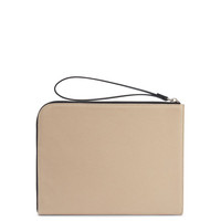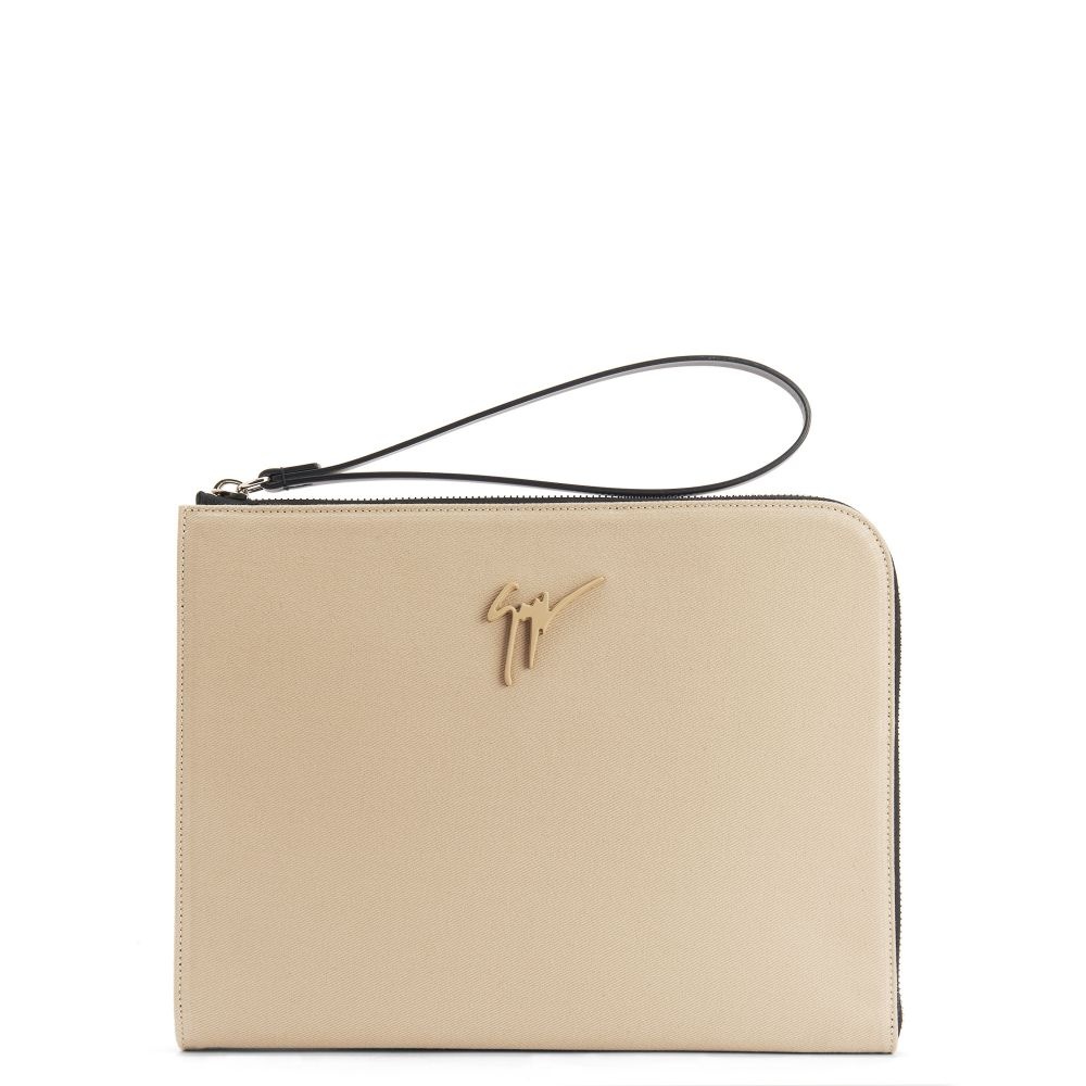 Product Details This pouch bag is crafted from beige cotton with fabric inner lining and features a metal zipper fastening on two sides and a leather wrist puller, and is embellished by the iconic matching rubberised metal 'Signature' detail. Beige cotton fabric Beige rubberised 'Signature' detail and nickel metal hardware Zipper fastening with big leather puller Suitable for hand carry Fabric inner lining Measurements: 330 mm x 250 mm x 30 mm Made in Italy