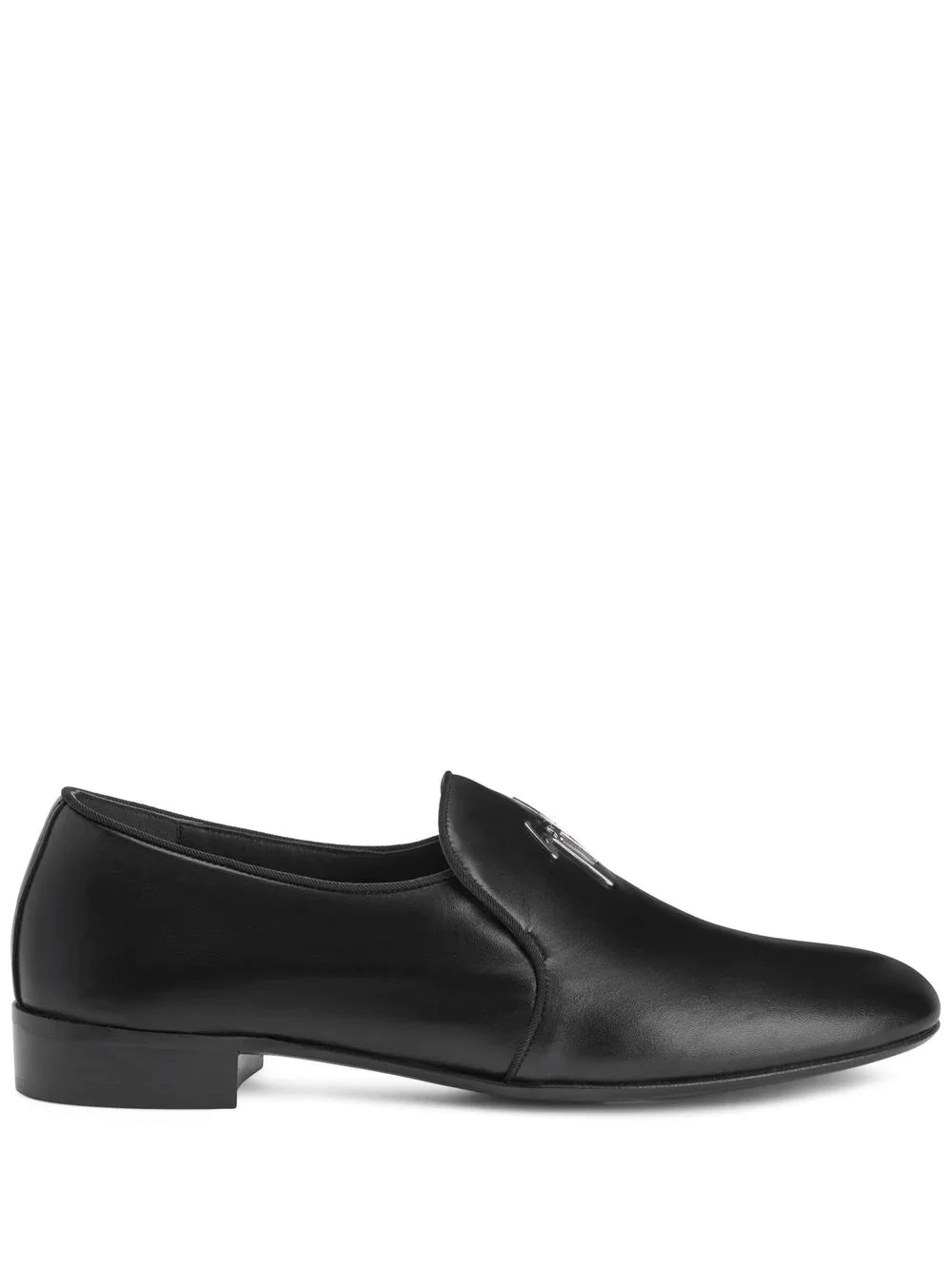 Fergus logo-plaque loafers Highlights - Fergus logo-lettering loafer from giuseppe zanotti featuring black, leather, silver-tone logo lettering, slip-on style, almond toe and branded insole. Made in Italy Composition Lining: Leather 100% Outer: Leather 100% Sole: Leather 100%
