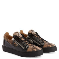 Product Details Low-top sneakers crafted from velvet-effect synthetic fabric with a beige and black python print and black patent leather, featuring a silver metal 'Signature' detail on the tongue and silver side zipper fastenings on the upper; a black rubber sole gives the design a perfect finish. Men's sneakers Beige python-print synthetic velvet fabric and black patent leather Silver metal 'Signature' hardware Black cotton laces Silver metal zippers Black rubber sole with logo Made in Italy