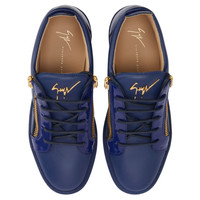 Product Details Low-top leather sneakers with glossy leather details, tonal laces, golden rubber-topped metal Signature detail on the tongue and matching side zippers on the upper. Tonal rubber sole. - Upper: 85% calfskin, 15% patent calfskin - Lining: calfskin - Insole: calfskin - Sole: Rubber ORIGIN: ITALY COLOR: BLUE