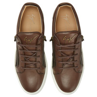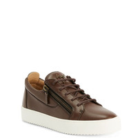 Product Details Low-top lace-up sneakers in leather with two side zips and rubber sole. - Men's sneakers - Brown leather - Aged brass-coloured metal Signature - Brown lacing - Aged-effect brass-coloured zip - White rubber sole with logo ORIGIN: ITALY COLOR: BROWN