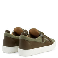Product Details These iconic and unmistakable Zanotti low-top sneakers have been reworked with an upper crafted in khaki leather and pure pre-washed cotton and feature silver rubberised metal 'Signature' hardware, matching cotton laces, silver metal zippers and white rubber soles. Khaki leather and pre-washed cotton fabric (100% CO) Silver metal 'Signature' hardware Green cotton laces Silver metal zippers White rubber sole with logo Made in Italy