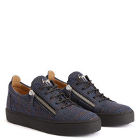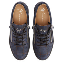 Product Details Low-top sneakers crafted from blue cotton tartan fabric, featuring black cotton laces, silver metal side zipper fastenings, a silver metal 'Signature' detail on the tongue and a black rubber sole. Men's sneakers Blue cotton tartan fabric Silver metal 'Signature' hardware Black cotton laces Silver metal zippers Black rubber sole with logo Made in Italy