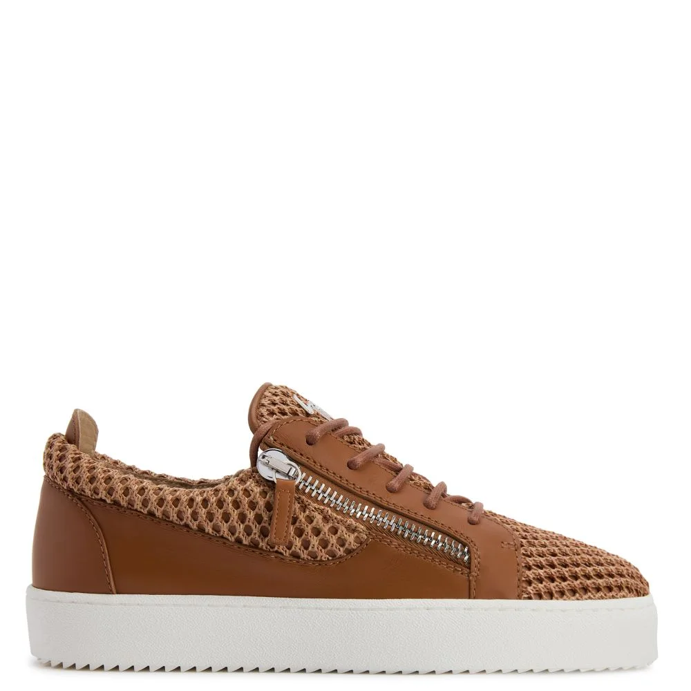 Product Details Low-top sneakers in crochet-effect fabric with tonal cotton laces, Signature detail on the tongue and palladium-colored metal side zippers. White rubber sole. - cognac-colored fabric - leather details - palladium-colored metal Signature detail - cotton laces - palladium-colored metal zippers - white rubber sole ORIGIN: ITALY COLOR: BROWN