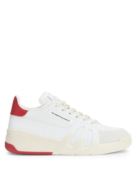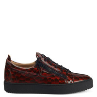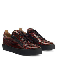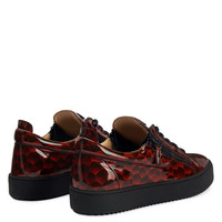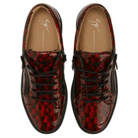 Product Details Low-top sneakers, crafted from glossy red synthetic fabric with geometric print, featuring black cotton laces, a black rubberised metal 'Signature' detail on the tongue and black plastic side zipper fastenings; a black rubber sole gives the design a perfect finish. Men's sneakers Glossy red synthetic fabric with geometric print Black rubberised metal 'Signature' Black cotton laces Black plastic zipper Black rubber sole with logo Made in Italy