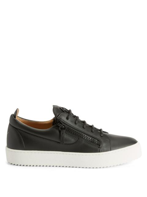 Product Details These low-top sneakers, crafted from black leather, feature a matching rubberised 'Signature' detail on the tongue and side zippers on the upper, a white rubber sole gives the design a perfect finish. Men's sneakers Black leather Black rubberised metal 'Signature' Debossed golden 'GZ' logo on the back Black cotton lacesper White rubber sole with logo Made in Italy