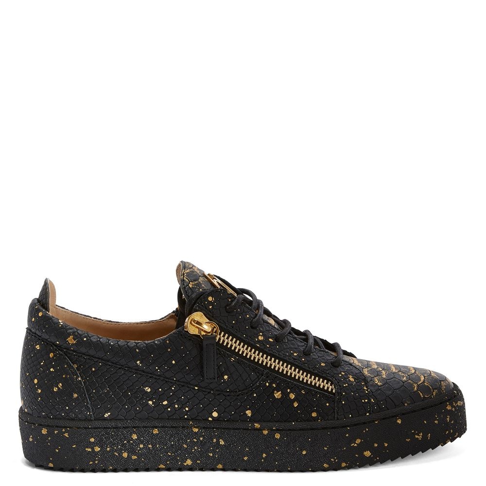 Product Details This iconic and unmistakable Zanotti low-top sneaker has been reworked with an upper crafted from black and golden python-print leather with metallic effect and features a black metal 'Signature' on the tongue. The silver side zippers and the matching rubber sole give the design a perfect finish. Metallic effect black and golden leather with python print Golden metal 'Signature' hardware Black cotton laces Black and gold rubber sole with logo Made in Italy