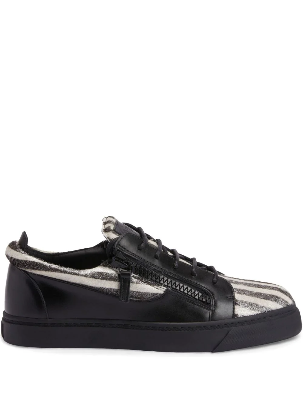 Frankie double-zip low-top sneakers Highlights - Black - Front lace-up fastening - Side zip fastening - Flat rubber sole - Vertical stripe pattern Made in Italy Composition Outer: Suede 100%, Calf Leather 100%, Pony Fur 100% Sole: Rubber 100% Lining: Calf Leather 100%