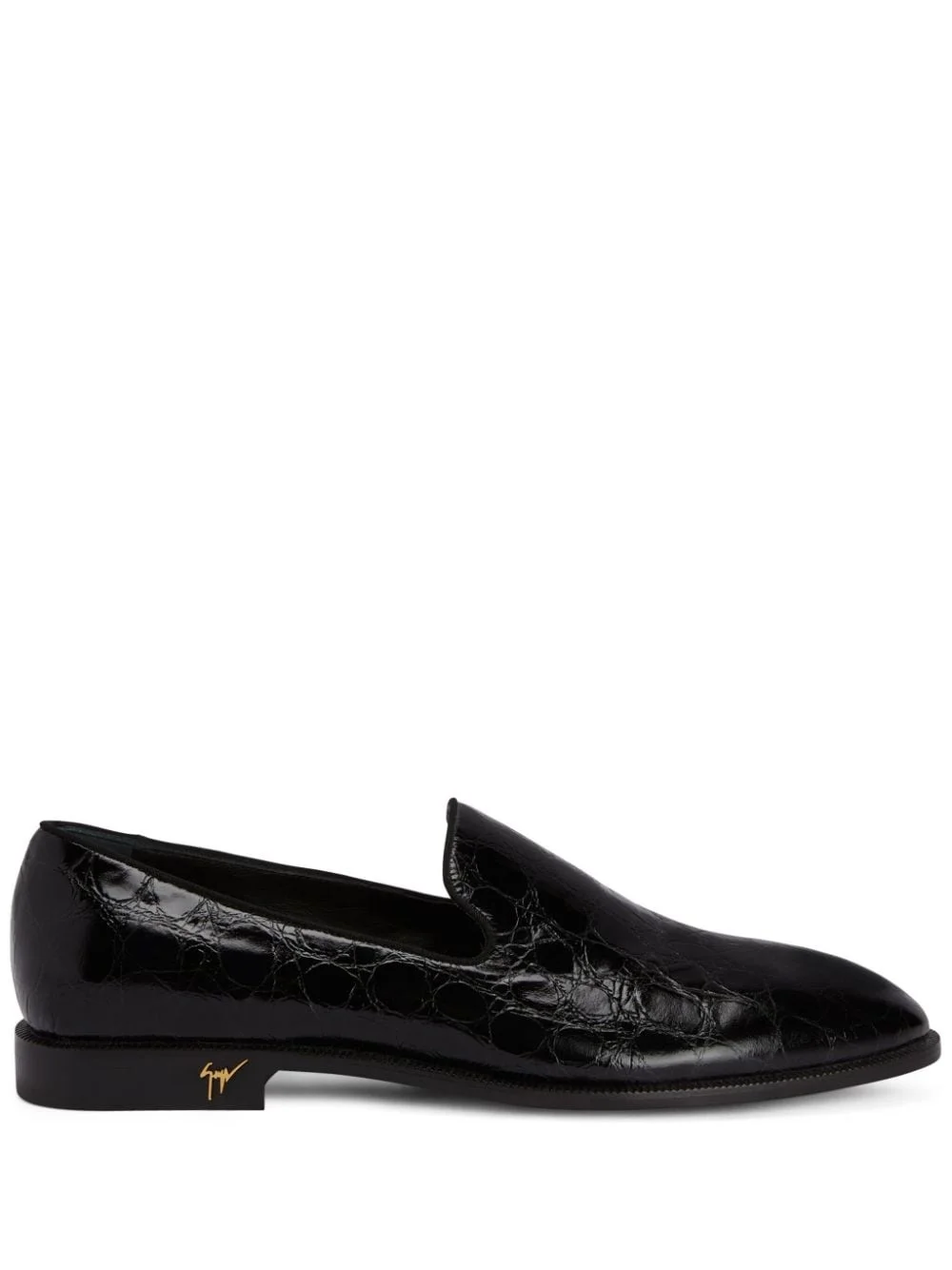 Gatien crocodile-effect leather loafers Expertly made in Italy from leather, this sleek black iteration of the Gatien loafers is embossed with an intricate crocodile effect throughout for a highly tactile finish. Branded at the insole for a recognisable finish, the pair speaks to Giuseppe Zanotti's craftsmanship and attention to detail. Highlights - Black - Leather - Embossed crocodile effect - Slip-on style - Almond toe - Branded leather insole - Low stacked heel Made in Italy Composition Outer: Leather 100% Sole: Leather 100% SIZE & FIT Measurement HEEL 0.78 in(2 cm)
