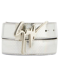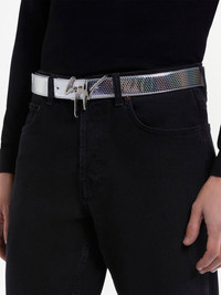 Signature buckle geometric-print belt Highlights - Silver-tone - Geometric print - Silver-tone logo lettering - Punch-hole detailing - Front buckle fastening Made in Italy Composition Polyurethane 50%, Polyester 50%