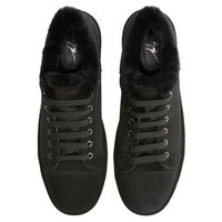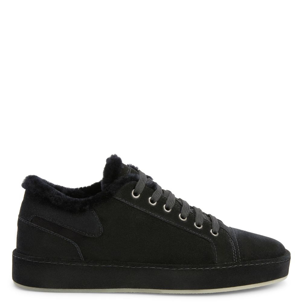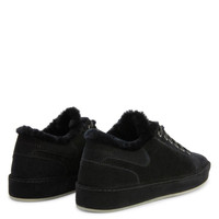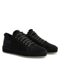 Product Details Suede lace-up low-top sneakers with sheepskin inner lining and tone-on-tone coated rubber sole. - Men's sneakers - Black suede leather - Black sheepskin inner lining - High-frequency detailing on the label - Black laces and aged silver-coloured metal eyelets - Rubber sole with logo, covered in black suede leather ORIGIN: ITALY COLOR: BLACK