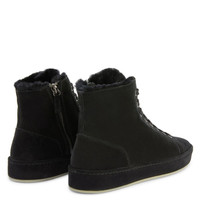Product Details Suede lace-up high-top sneakers with sheepskin inner lining and tone-on-tone coated rubber sole. - Men's sneakers - Black suede leather - Black sheepskin inner lining - High-frequency detailing on the label - Black laces and aged silver-coloured metal eyelets - Rubber sole with logo, covered in black velvety suede leather ORIGIN: ITALY COLOR: BLACK
