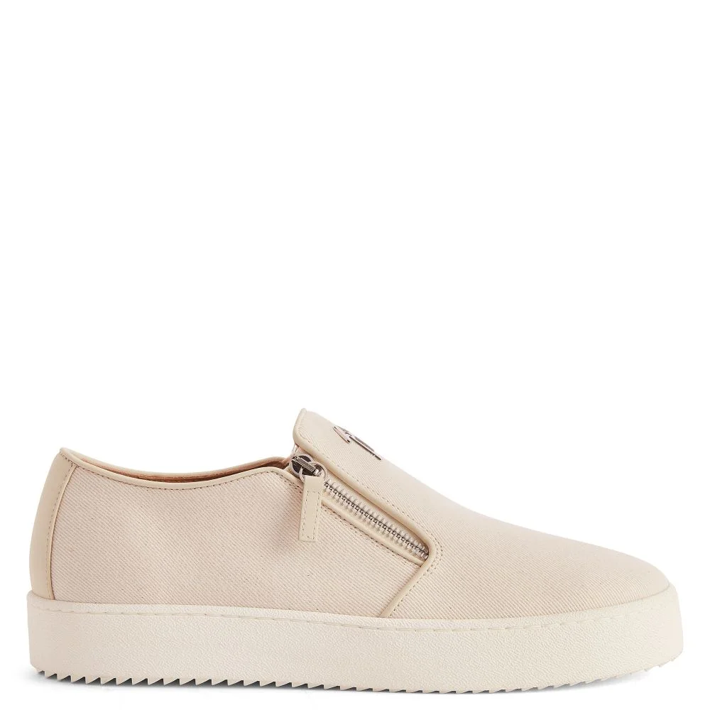 Product Details Textile slip-on with metal Signature detail, double side zip and rubber sole. - black - palladium-tone metal Signature leather - palladium-colored metal zipper - white rubber sole ORIGIN: ITALY COLOR: IVORY