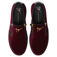 Product Details Slip-ons in velvet with metal Signature detail, two side zippers and rubber sole. - Upper: 90% velvet, 10% calfskin - Lining: calfskin - Insole: calfskin - Sole: Rubber ORIGIN: ITALY COLOR: RED