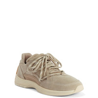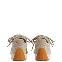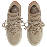 Product Details Low-top lace-up sneakers in suede with double lacing, rubber sole and tread. - Men's sneakers - Beige suede - Neutral-coloured high frequency-processed Signature on the label and neutral-coloured screen print on the beige suede upper - Black TPU accessory bearing the Giuseppe Zanotti logo at the side - Double lacing: one monochrome beige and the other with beige base and white and off-white stripes - Off-white rubber sole with amber tread and logo ORIGIN: ITALY COLOR: GREY