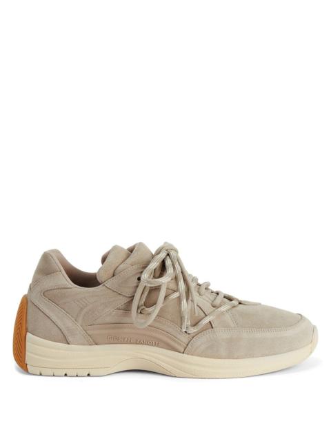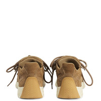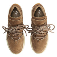 Product Details Low-top lace-up sneakers in suede with double lacing, rubber sole and tread. - Men's sneakers - Light brown suede - Neutral-coloured high frequency-processed Signature on the label and neutral-coloured screen print on the light brown suede upper - Black TPU accessory bearing the Giuseppe Zanotti logo at the side - Double lacing: one monochrome light brown and the other with light brown base and light grey and off-white stripes - Off-white rubber sole with amber tread and logo ORIGIN: ITALY COLOR: BROWN