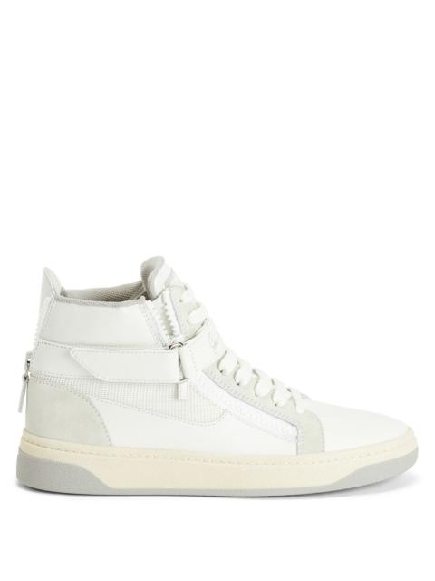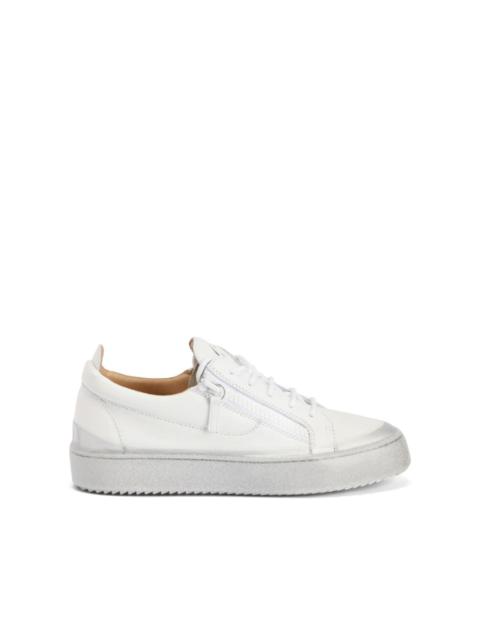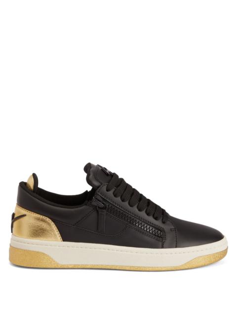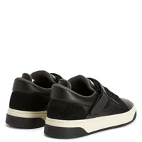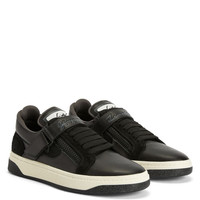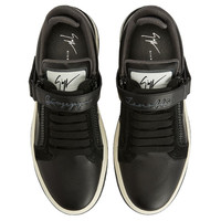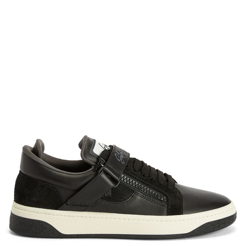 Product Details Low-top sneakers crafted from black leather, velour and synthetic mesh fabric with matching cotton laces, featuring off-white rubber soles with black treads, contrasting 'Signature' labels on the tongues, grey 'Giuseppe' print straps and black plastic side zippers. Men's sneakers Black leather, velour and synthetic mesh fabric Grey 'Giuseppe' print on strap Off-white fabric 'Signature' label with black trims Black cotton laces Off-white rubber sole, black tread with logo Made in Italy