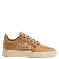 Product Details Low-top lace-up sneakers in leather and mesh fabric with rubber sole. - Men's sneakers - Beige mesh fabric and leather - Hot-stamped Signature on the label - Hot-stamped logo lettering on the upper at the back - Beige lacing and beige rubber-topped metal eyelets - Off-white rubber sole with logo ORIGIN: ITALY COLOR: BEIGE