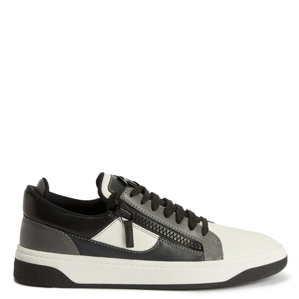 Product Details Low-top lace-up sneakers in leather with two side zips and two-tone rubber sole. - White, dark-grey and black leather - Dark-grey lacquered metal 'Signature' - Black cotton laces - White rubber sole and black tread with logo ORIGIN: ITALY COLOR: BLACK