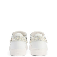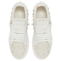 Product Details Low-top lace-up sneakers in suede-effect fabric with bead and rhinestone embroidery, two tonal side zips and rubber sole. - Men's sneakers - White leather and suede-effect fabric - Embroidery with beads and crystal-coloured rhinestones - High frequency-processed Signature on the label - White lacing - White rubber sole with logo ORIGIN: ITALY COLOR: WHITE