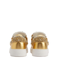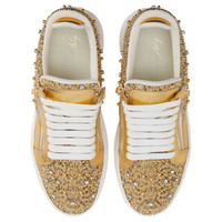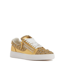 Product Details Low-top lace-up sneakers in suede-effect fabric and laminated leather with bead and rhinestone embroidery, two side zippers and rubber sole. - Mens sneakers - Beige suede-effect fabric and golden laminated-finish leather - Golden rhinestone and bead embroidery - High frequency-processed Signature on the label - White lacing - White rubber sole with logo ORIGIN: ITALY COLOR: BEIGE
