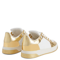 Product Details These low-top sneakers, crafted from white and golden laminated leather and golden mirror-effect synthetic fabric, feature matching cotton laces and rubberised eyelets, a golden hot-stamped ‘Signature’ detail on the tongue, a golden debossed ‘Logo Lettering’ on the back of the upper and off-white rubber soles with golden chrome treads. - Men's sneakers - White leather, golden laminated leather and mirror-effect synthetic fabric - Golden hot-stamped 'Signature' on tongue - Golden 'Logo Lettering' print on the back - White cotton laces and rubberised eyelets - Off-white rubber sole, chromed gold tread with logo - Made in Italy ORIGIN: ITALY COLOR: WHITE