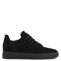 Product Details Low-top lace-up sneakers in suede leather with fur interior and rubber sole. - Mens sneakers - Black suede leather - Black fur interior - Hot-stamped Signature on the label and hot-stamped logo lettering on the back of the upper - Black lacing and black rubber-effect metal eyelets - Black rubber sole with logo ORIGIN: ITALY COLOR: BLACK