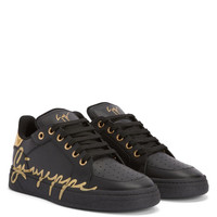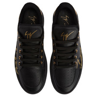 Product Details These low-top sneakers, crafted from black leather and mirror-effect golden synthetic fabric, feature cotton laces and golden metal eyelets and are embellished with a golden hot-stamped 'Signature' detail on the tongue and by a golden 'Lettering Logo' print on the back of the upper; the design is complete with a golden laminated 'Giuseppe' lettering on the outer side of the shoe and with a rubber sole with logo. Men's sneakers Black leather and mirror-effect golden synthetic fabric Golden 'Giuseppe Zanotti' laminated lettering on upper and sole Golden hot-stamped 'Signature' on label Golden 'Logo Lettering' print on the back Black cotton laces and golden metal eyelets Rubber sole with logo Made in Italy
