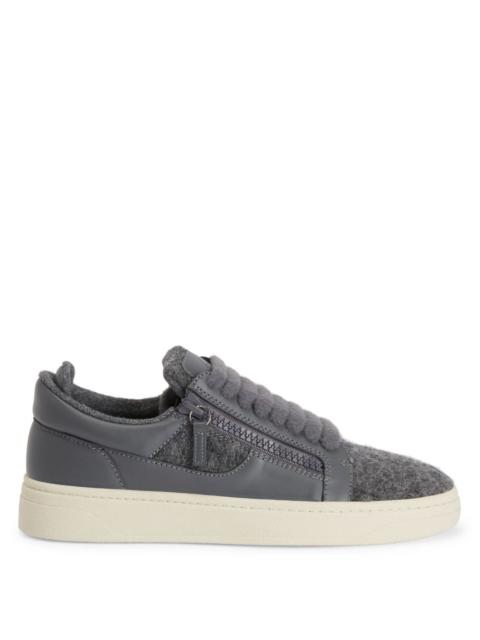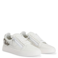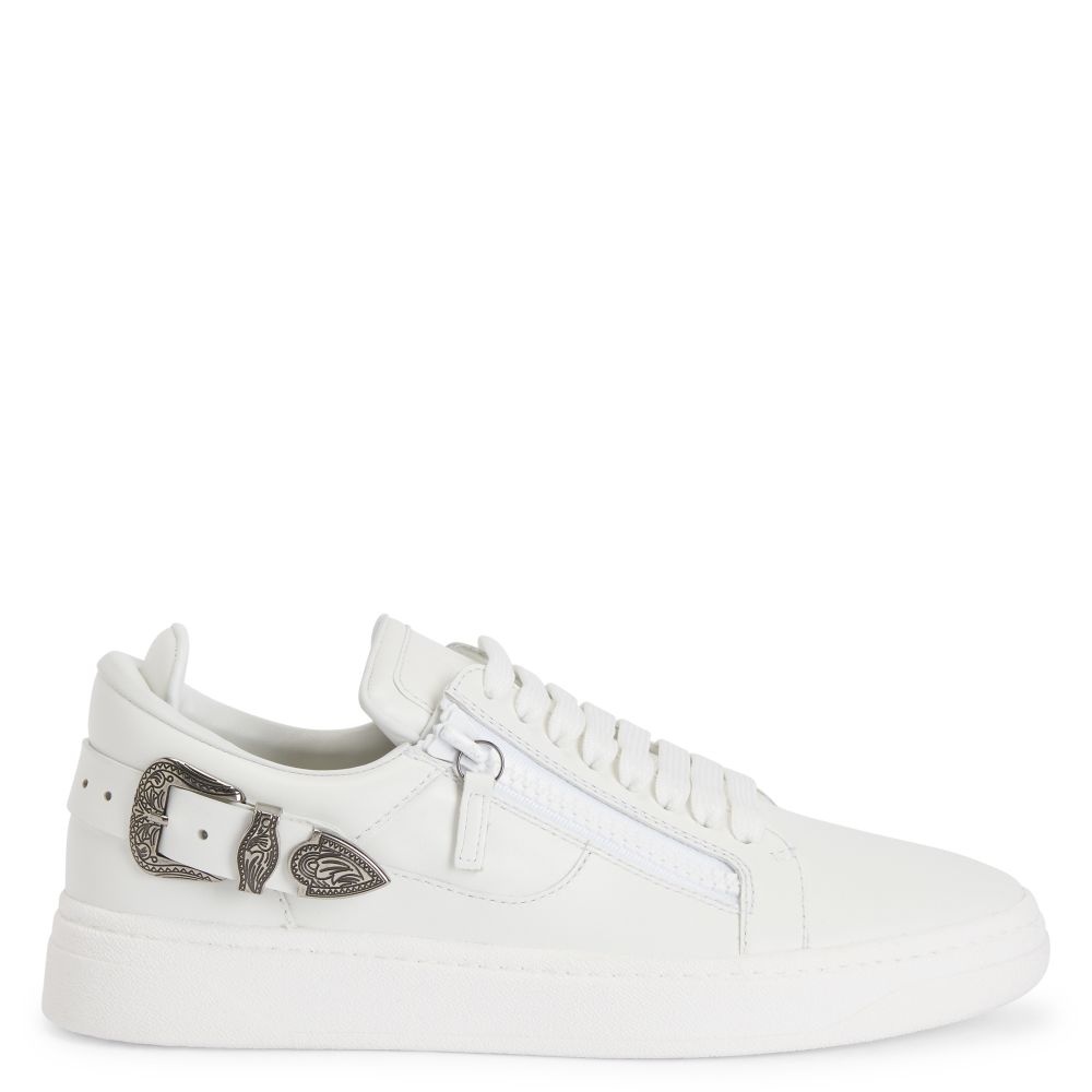 Product Details Low-top leather lace-up sneakers with two side zippers, a buckle detail in inlaid metal, and a rubber sole. - Men's sneakers - White leather - Signature embossed on the label - Gunmetal hardware - White laces - White rubber sole with logo< ORIGIN: ITALY COLOR: WHITE
