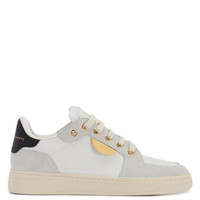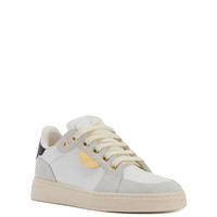 Product Details Low-top leather and suede sneakers with cotton laces, golden-finish metal eyelets, gold-colored hot-stamped Signature detail on the tongue, gold-colored logo lettering printed on the heel, and metal detail on the upper. Complete with rubber sole. - Upper: 60% calfskin, 40% suede - Lining: 100% polyamide - Insole: calfskin - Sole: Rubber ORIGIN: ITALY COLOR: WHITE